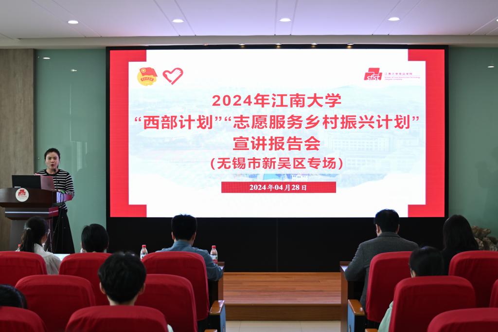 为深入学习贯彻习近平新时代中国特色社会主义思想和党的二十大精神,引导和鼓励高校毕业生积极投入基层建设与乡村振兴火热实践中,4月28日下午,2024年我校“西部计划”“志愿服务乡村振兴计划”宣讲报告会(第七场无锡新吴区专场)在welcome皇冠地址D912报告厅举行。无锡市新吴区团区委副书记林星州、welcome皇冠地址分团委书记李金杰、毕业班辅导员王文燕出席活动,100余名应届毕业生及在读研究生共同参加活动。宣讲会由本科生辅导员曹敏主持。